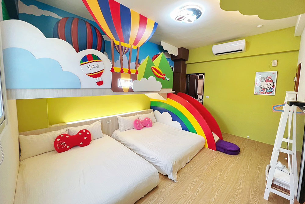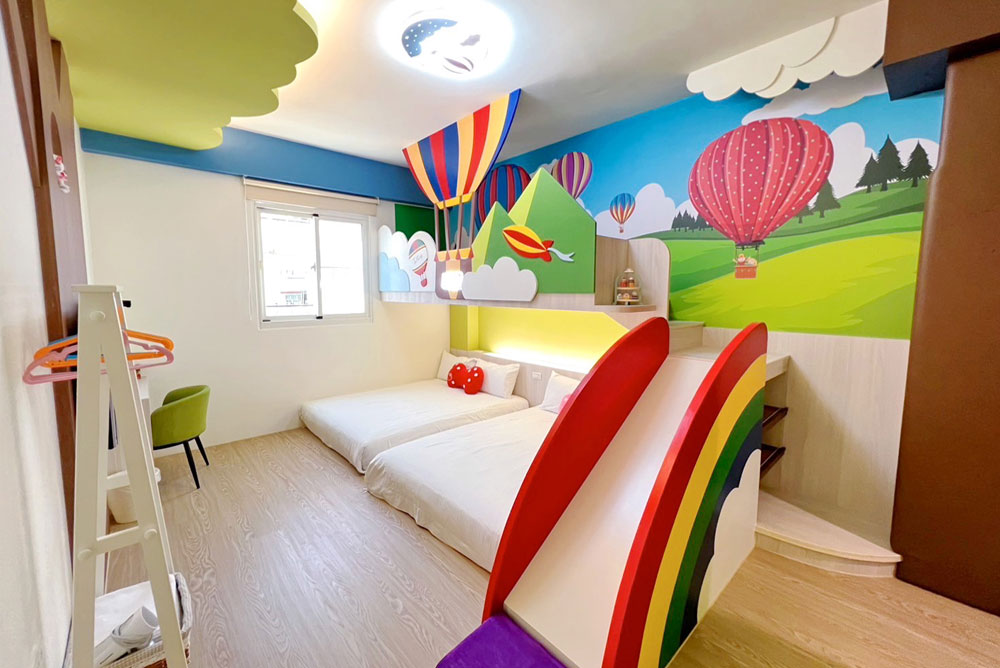 - 四人房內皆有溜滑梯。三樓公共空間也有龍貓溜滑梯遊戲區。