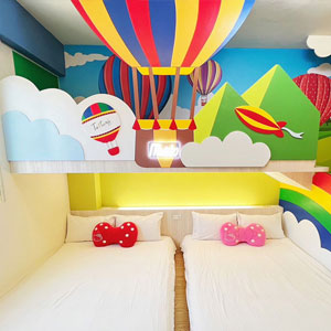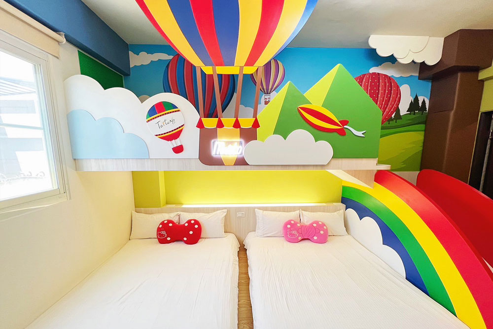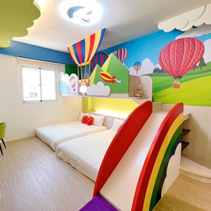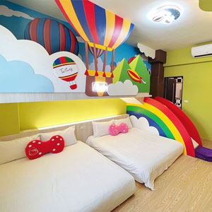 - 加床是加床墊,除了繽紛糖果屋、動物派對沒有高低差,其他房型加床墊在地上會比較低一些喔。